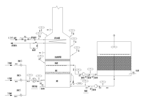 (1)冷凝降溫和除霧模塊:煙氣通過原引風(fēng)機(jī)后進(jìn)入該模塊,模塊填料段上部布冷卻水、底部出水,水與煙氣直接接觸,煙氣溫度由60度降低至35度,煙氣中有機(jī)氣體冷凝至直接接觸的水中,且煙氣中有少量氣態(tài)水析出為液體水,煙氣夾帶有霧沫進(jìn)入除霧器后使氣液完全分離。