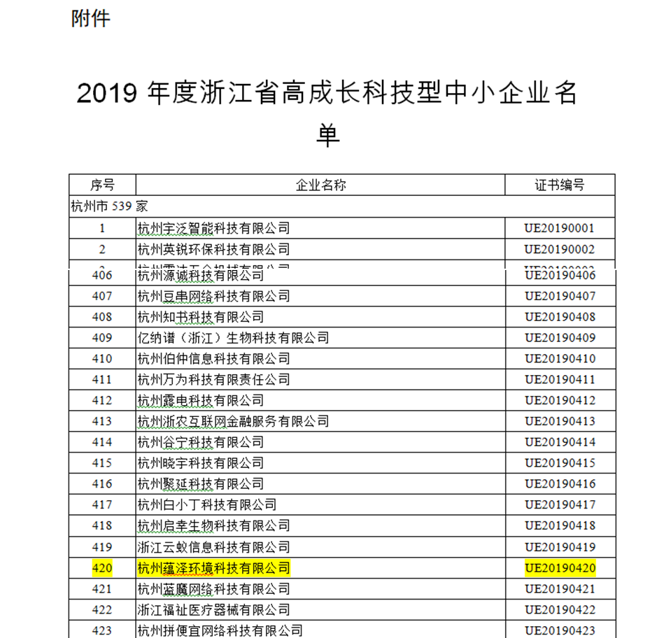 根據(jù)省科技廳印發(fā)的《浙江省高成長科技型中小企業(yè)評價指導(dǎo)性意見》(浙科發(fā)高〔2016〕87號)和《關(guān)于組織開展2019年度高成長科技型中小企業(yè)評價的通知》(浙科發(fā)高〔2019〕46號)有關(guān)規(guī)定,經(jīng)科技管理部門組織評價、研究決定,評選結(jié)果客觀、真實,如實反映了企業(yè)的綜合實力。“杭州蘊澤環(huán)境科技有限公司”認(rèn)定為2019年度浙江省高成長科技型中小企業(yè)。