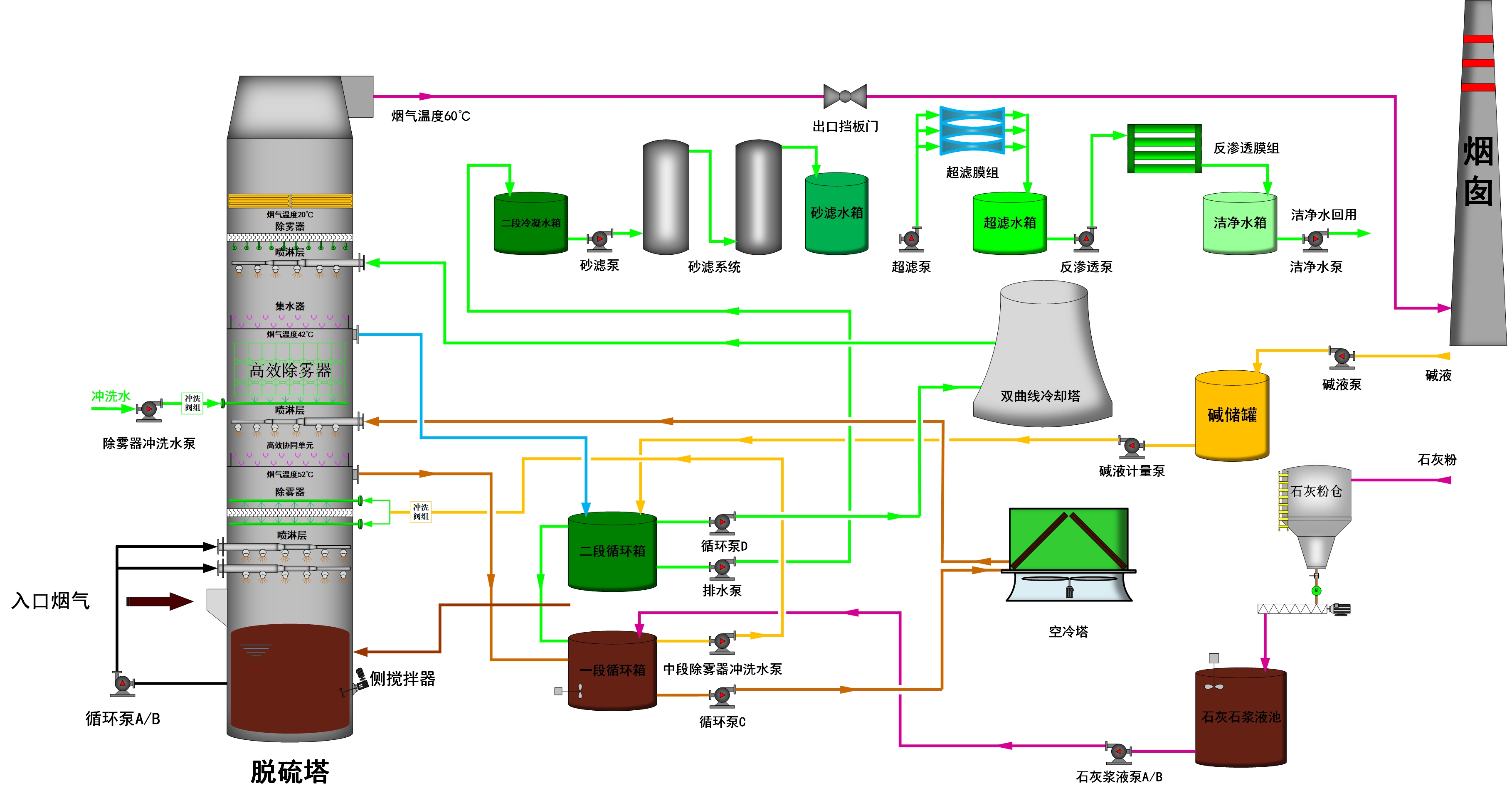只需對濕法脫硫塔上段進行改造,投資費用少,整體改造周期<30天,運行成本低。