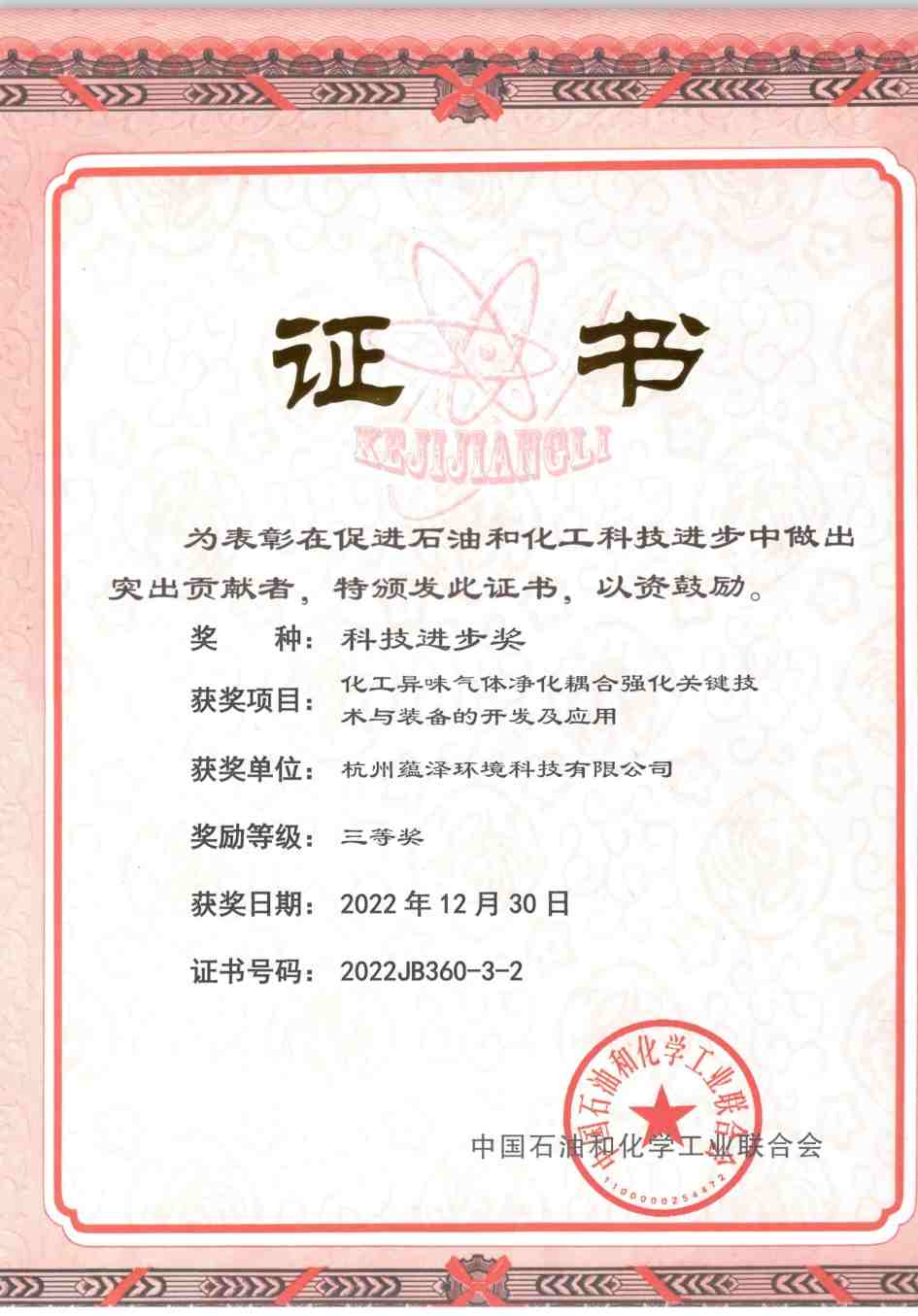 2022年12月30日,根據(jù)《中國石油和化學(xué)工業(yè)聯(lián)合會科學(xué)技術(shù)獎勵辦法》及《石油和化工行業(yè)專利獎獎勵辦法》的有關(guān)規(guī)定,經(jīng)中國石油和化學(xué)工業(yè)聯(lián)合會科技獎勵評審委員會終審決定,特別表彰杭州蘊澤環(huán)境科技有限公司在促進石油和化工科技進步中做出的突出貢獻,授予蘊澤環(huán)境科技進步獎三等獎,并頒發(fā)榮譽證書和獎牌。本次獲獎的技術(shù)——“化工異味氣體凈化耦合強化關(guān)鍵技術(shù)與裝備的開發(fā)及應(yīng)用”獲得了中國石油和化學(xué)工業(yè)聯(lián)合會專家組的高度評價與認可,是對我司技術(shù)創(chuàng)新、推廣應(yīng)用工作的鼓勵、支持與信任。